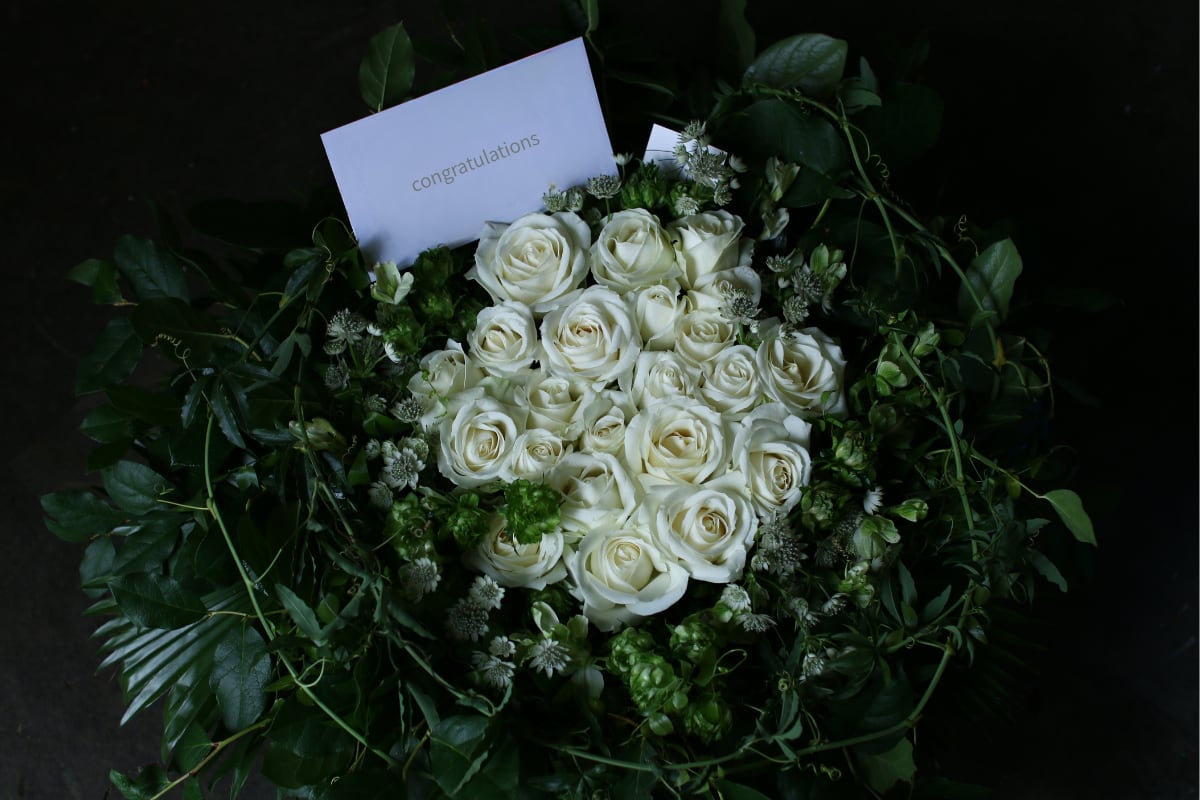 オアシス(専用の吸水スポンジ)にカットした草花を生けておりますので、お受け取り後すぐに飾っていただけます。