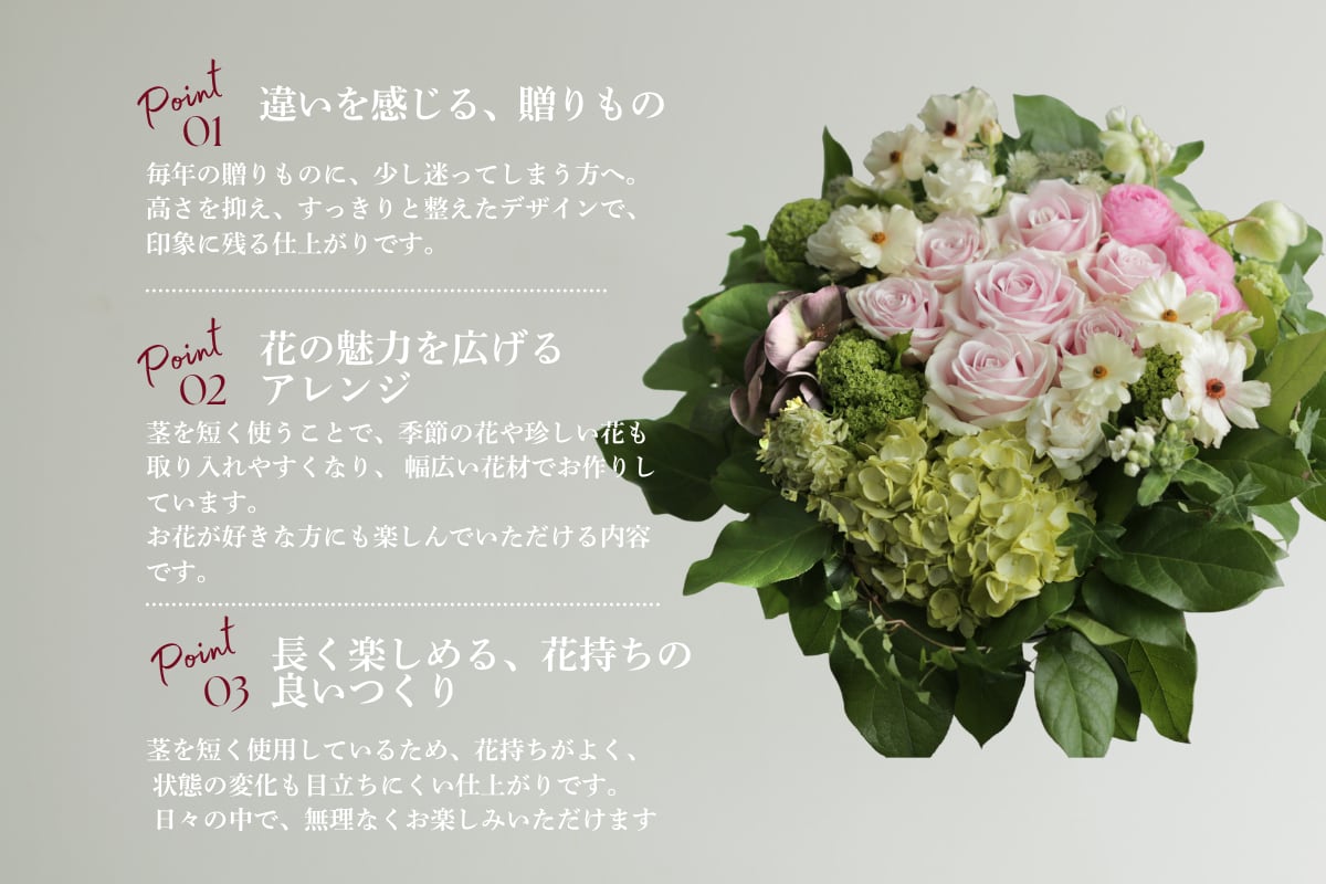 さまざまなお花の表情や色の組み合わせを楽しんでいただける仕上がりに。