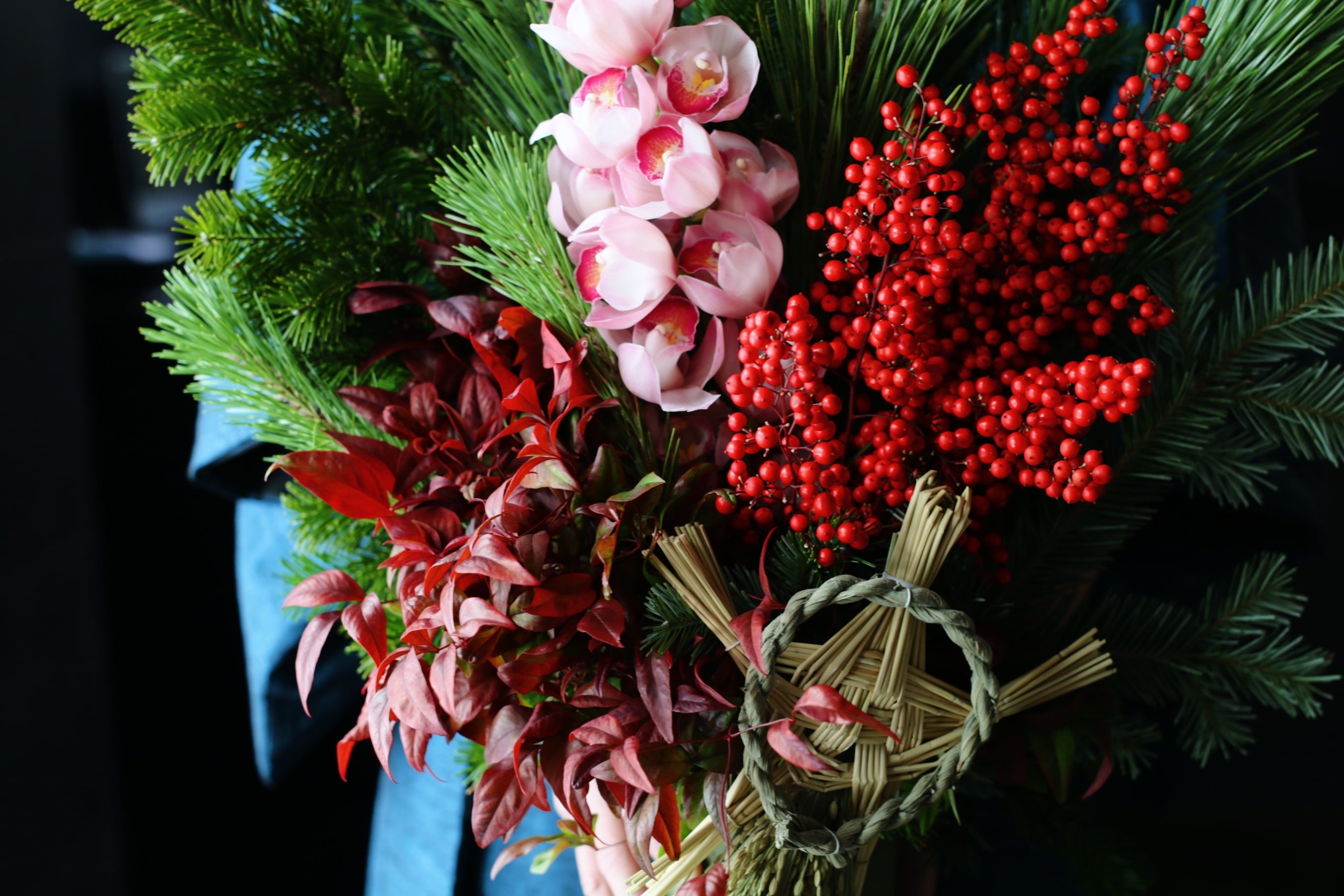稲穂亀/南天の実/シンビジューム/おたふく南天/若松/トド松/竹器
