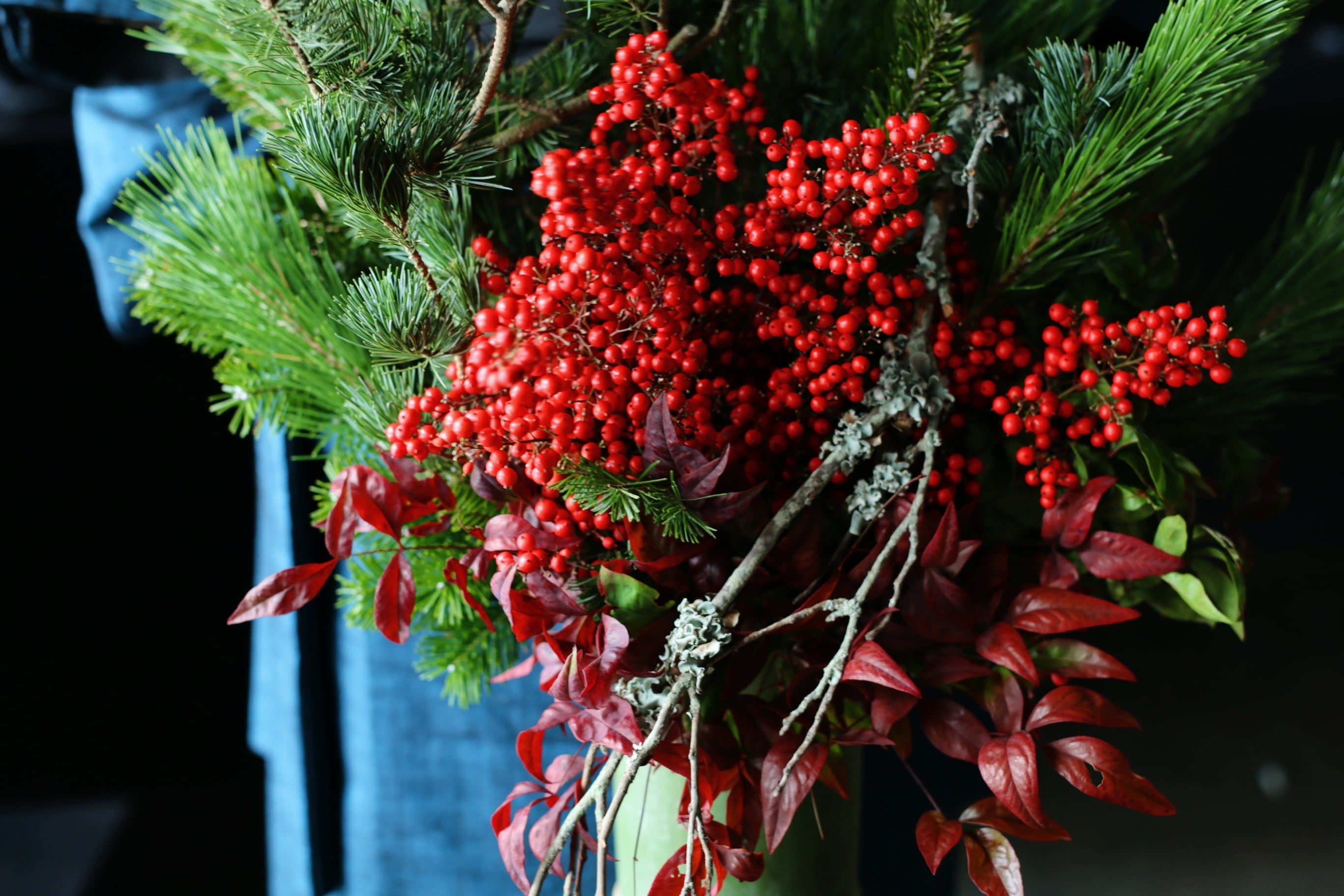 竹の器に希少な宮島五葉松や南天の実、苔木などをあしらった豪華なアレンジメントです。